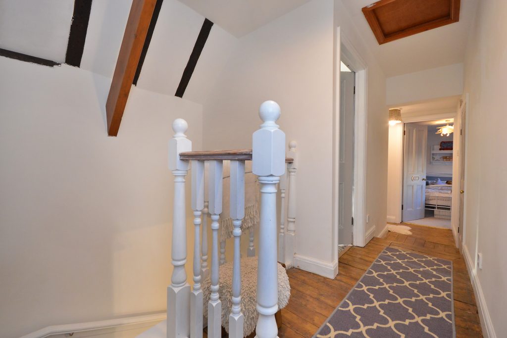 The first-floor landing has a large built-in airing cupboard providing useful storage space. With an exposed stone wall, three light points, loft hatch, radiator, single power point and double-glazed window to the rear elevation.