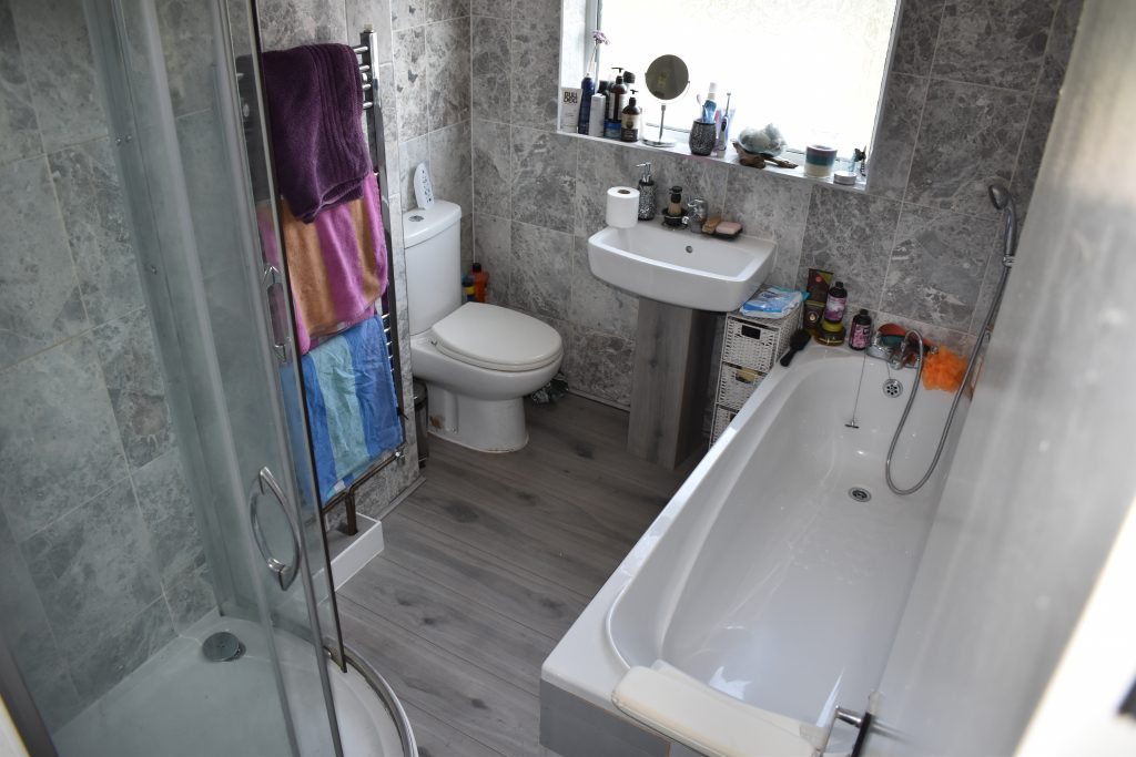 With UPVC double glazed opaque window to the rear, four piece suite comprising bath with shower head mixer taps, wash hand basin, W.C, corner shower cubicle, chrome towel rail radiator, wall tiling and ceiling light point.