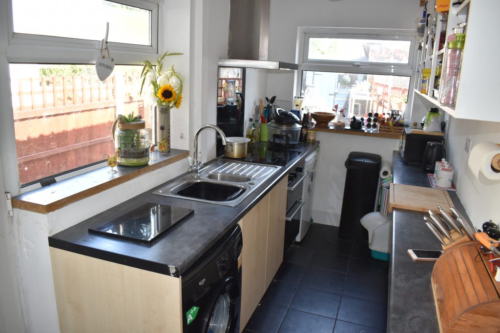With UPVC double glazed window to the side and rear, wall and base units with roll top work surfaces, stainless steel sink, space and plumbing for washing machine, integrated oven, integrated hob with extractor over, power points and ceiling light point.