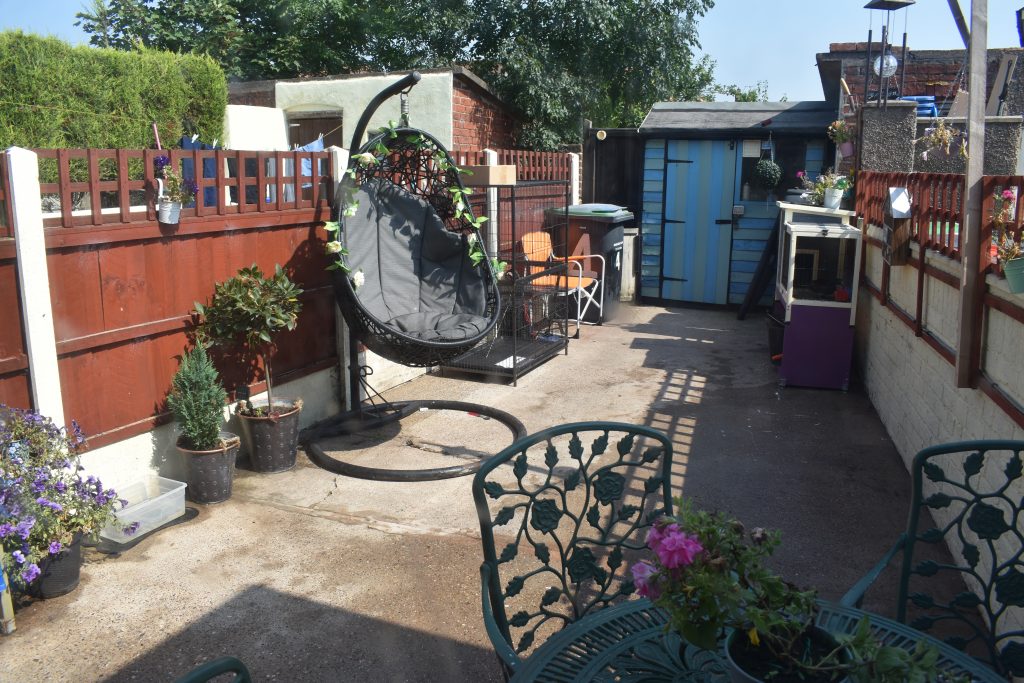 Enclosed low maintenance rear garden with hard standing for garden shed.