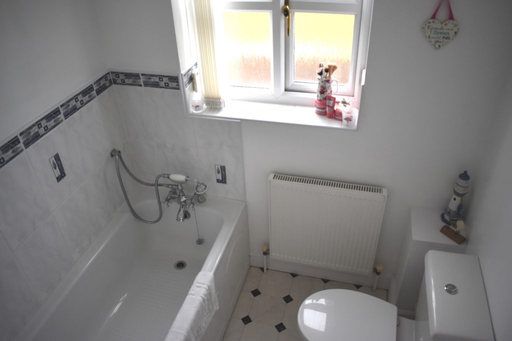 Fitted with a three-piece white suite comprising panelled bath with shower head mixer tap with part wall tiling, W.C. and wash hand basin with tiled splashback. UPVC double glazed opaque window to the rear and radiator.