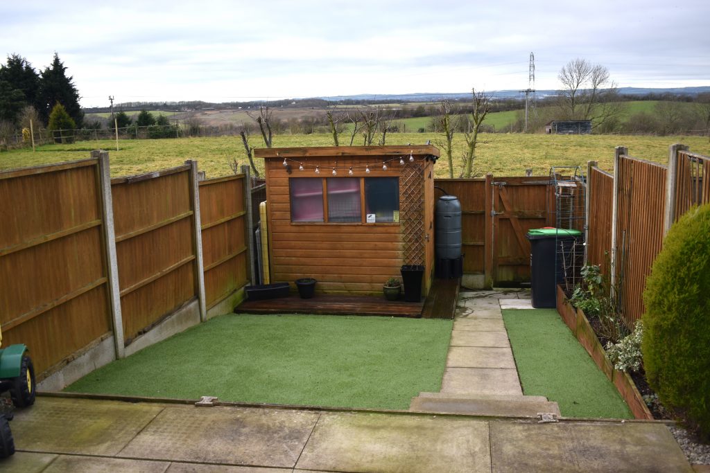 The low-maintenance rear garden is fully enclosed with fencing. There is a patio area, and planted borders with a pathway leading to the garden shed and gate to rear access alleyway.