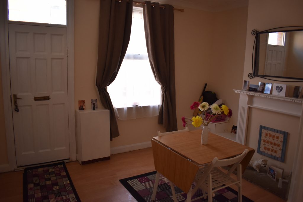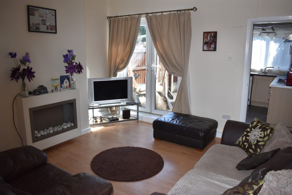 With double glazed patio doors onto the rear, radiator, ceiling light point, power points and electric feature fire.