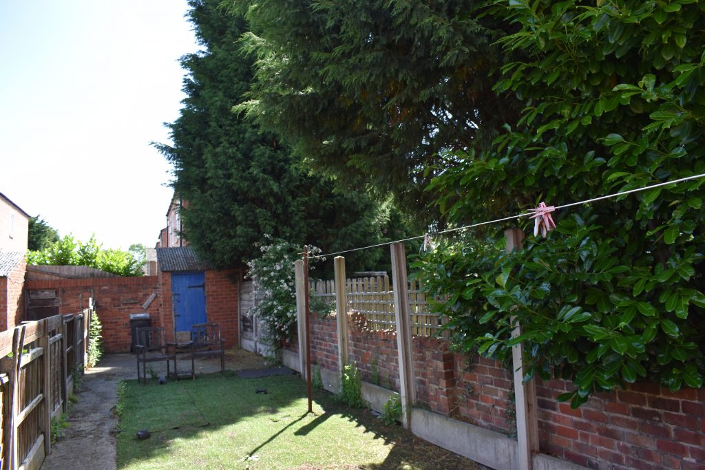 Rear garden with artificial lawn, pathway leading to patio area and outbuilding.
