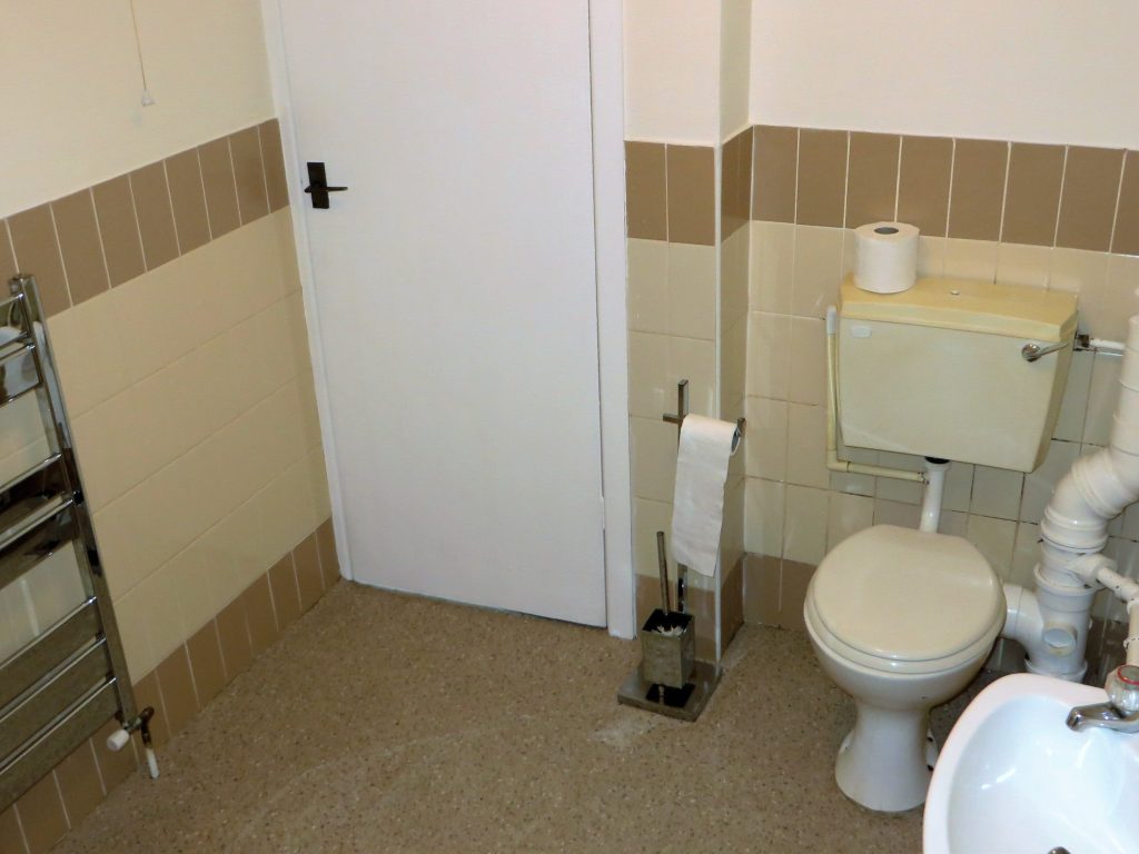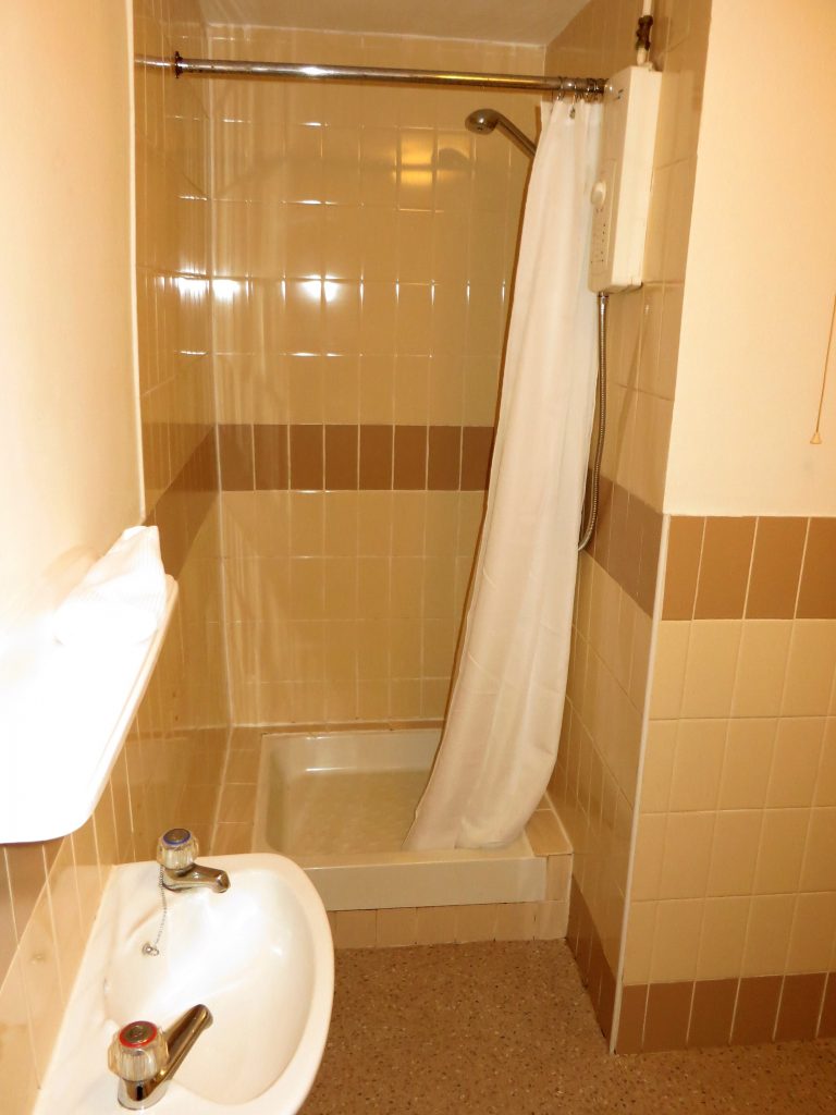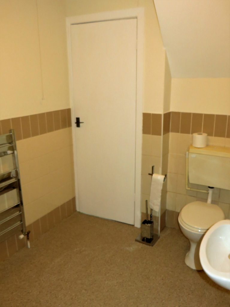 With part wall tiling, shower with Mira electric shower, close coupled W.C, wall mounted wash hand basin and chrome towel rail radiator.