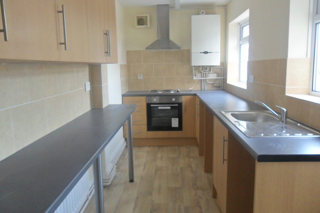With two UPVC double glazed windows to the side, wall mounted Baxi boiler, single drainer stainless steel sink, a range of wall and base units with roll top work surfaces, breakfast bar, integrated electric oven and stainless-steel hob with stainless-steel chimney extractor, space and plumbing for washing machine and space for fridge freezer