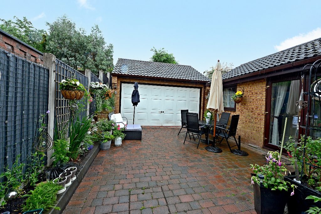 To the front of the property there is a garden which is laid with artificial lawn and a block paved driveway providing parking for several vehicles. A second driveway with gated access continues to the side of the property leading to a versatile detached double garage; this space provides an ideal outside seating and dining area. There is a further rear garden area which is decked and enclosed by fencing.