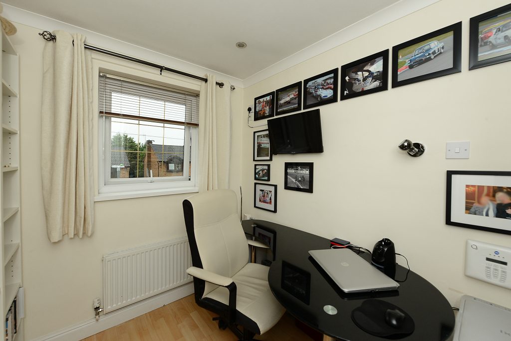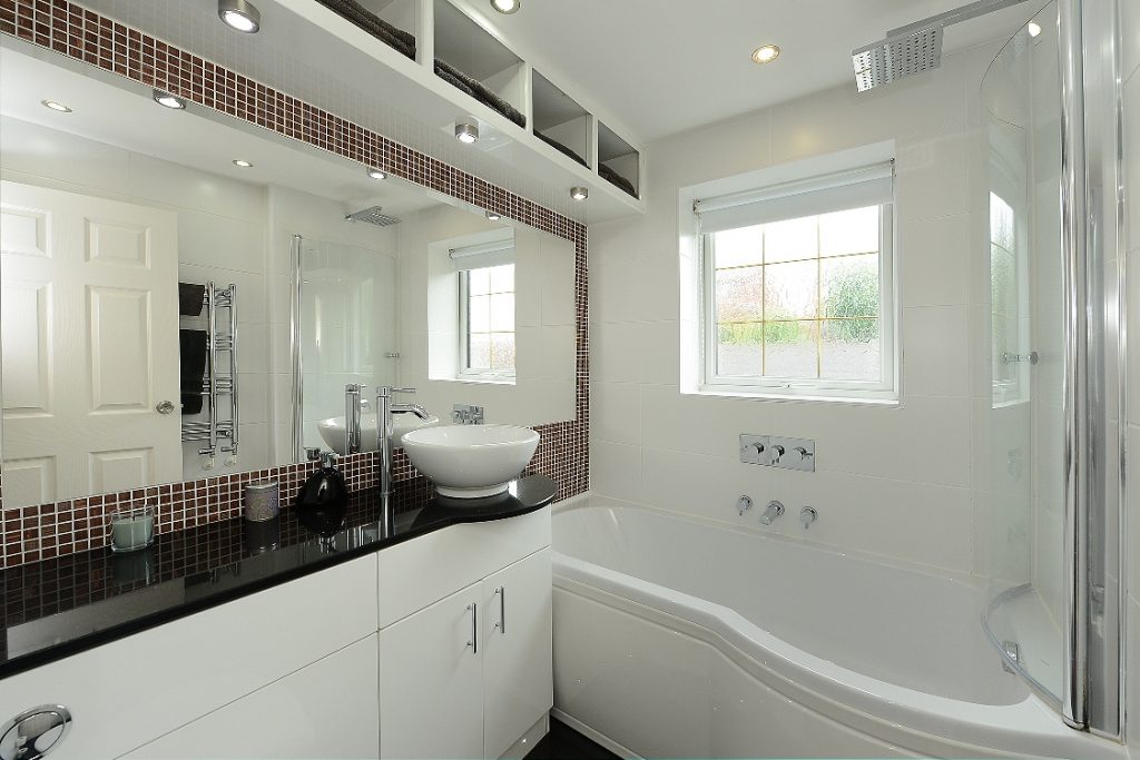 This designer bathroom makes a real statement and is reflective of the standard and quality throughout the property. Having a three-piece white suite comprising close coupled W.C, wash hand bowl with mixer tap and underneath storage cupboard, bath with mixer tap and rainfall shower over, double glazed opaque window to the rear, radiator, overhead storage, wall tiling and multiple spotlights.
