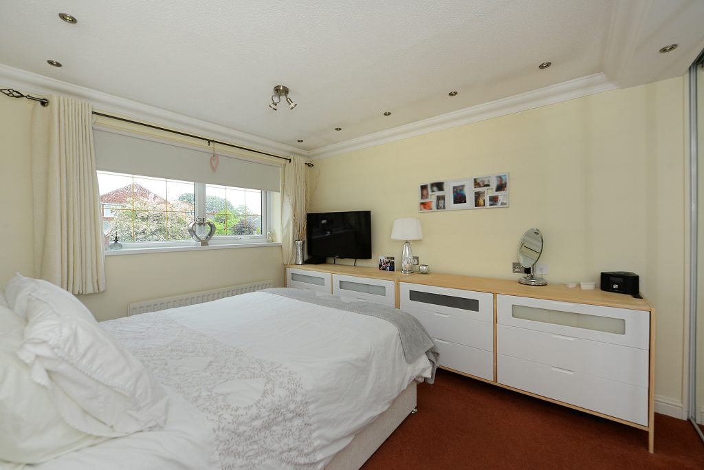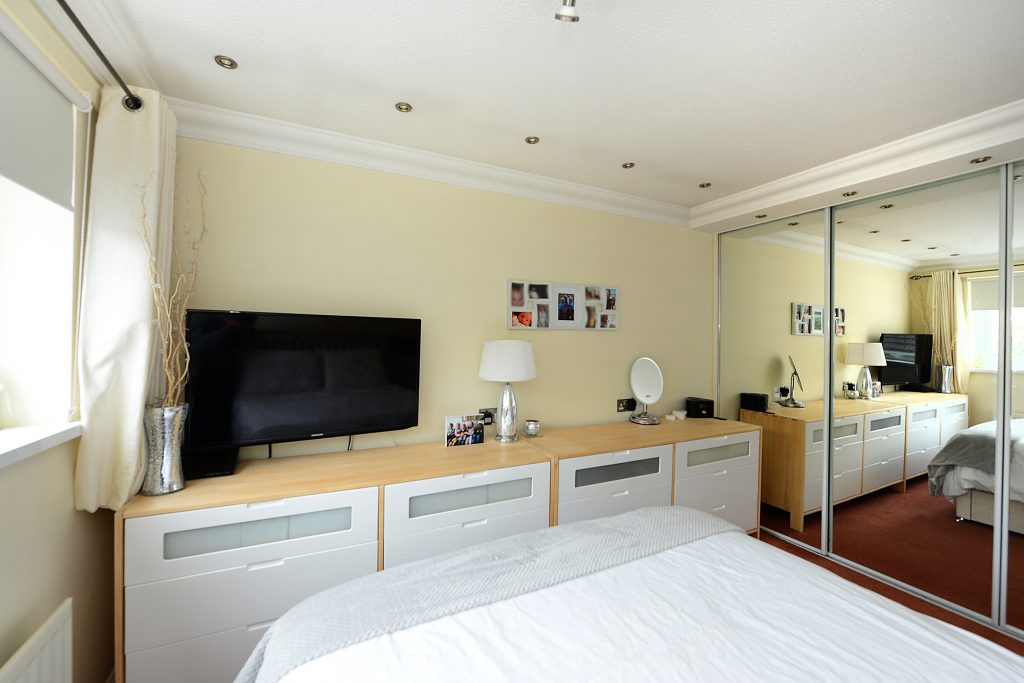 A well-proportioned double bedroom with fitted wardrobes, radiator, double glazed window to the rear, power points, ceiling coving, ceiling light point and spotlights.