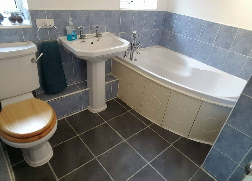 The bathroom has a three-piece suite comprising a large corner bath, pedestal wash hand basic and close couple W.C, there is a tiled floor, part wall tiling, two UPVC double glazed opaque windows to the side, radiator and ceiling light point.