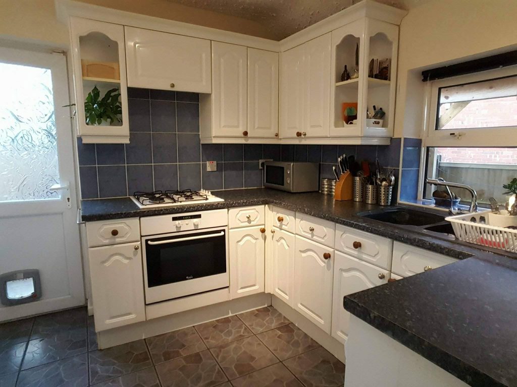 Having a range of wall, drawer and base units with roll top work surfaces, space for fridge freezer, space for washing machine, built in electric cooker and four-point gas hob, radiator, one and half bowl sink with chrome mixer taps, numerous power points, ceiling light point, UPVC double glazed window to the side and UPVC double glazed door to the rear.