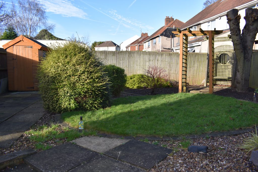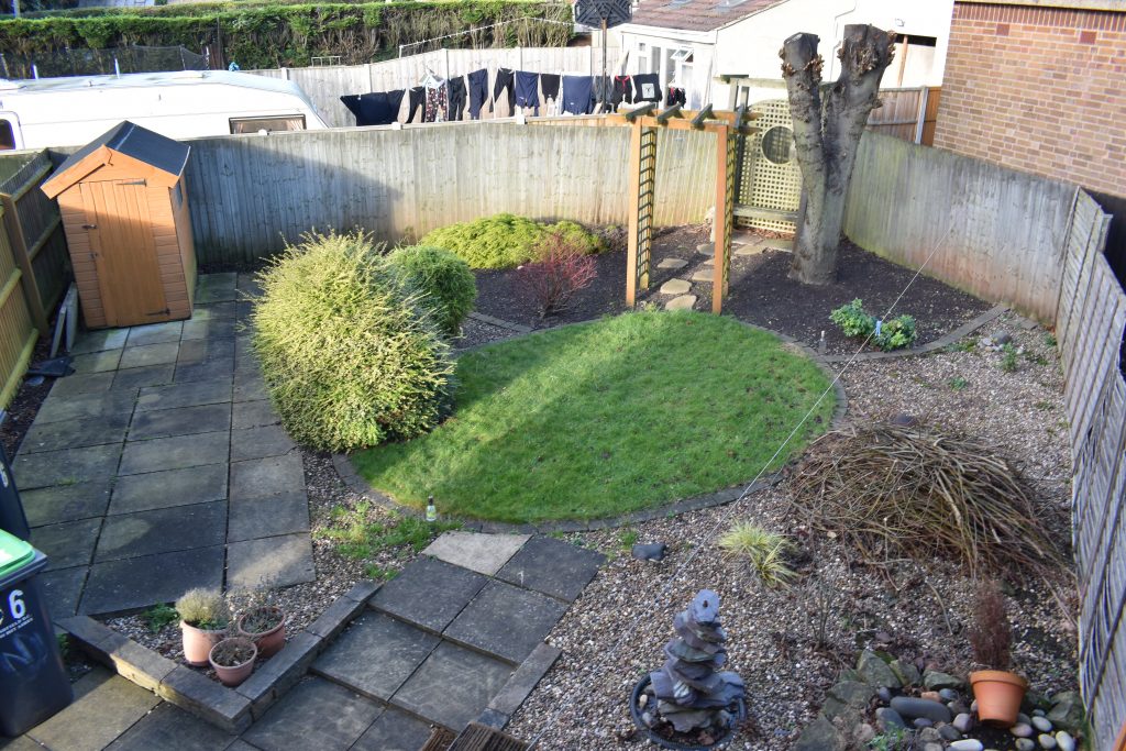 Enclosed low maintenance rear garden with patio area and hard standing for garden shed. There are also various areas laid to lawn, pea gravel and a flower bed.