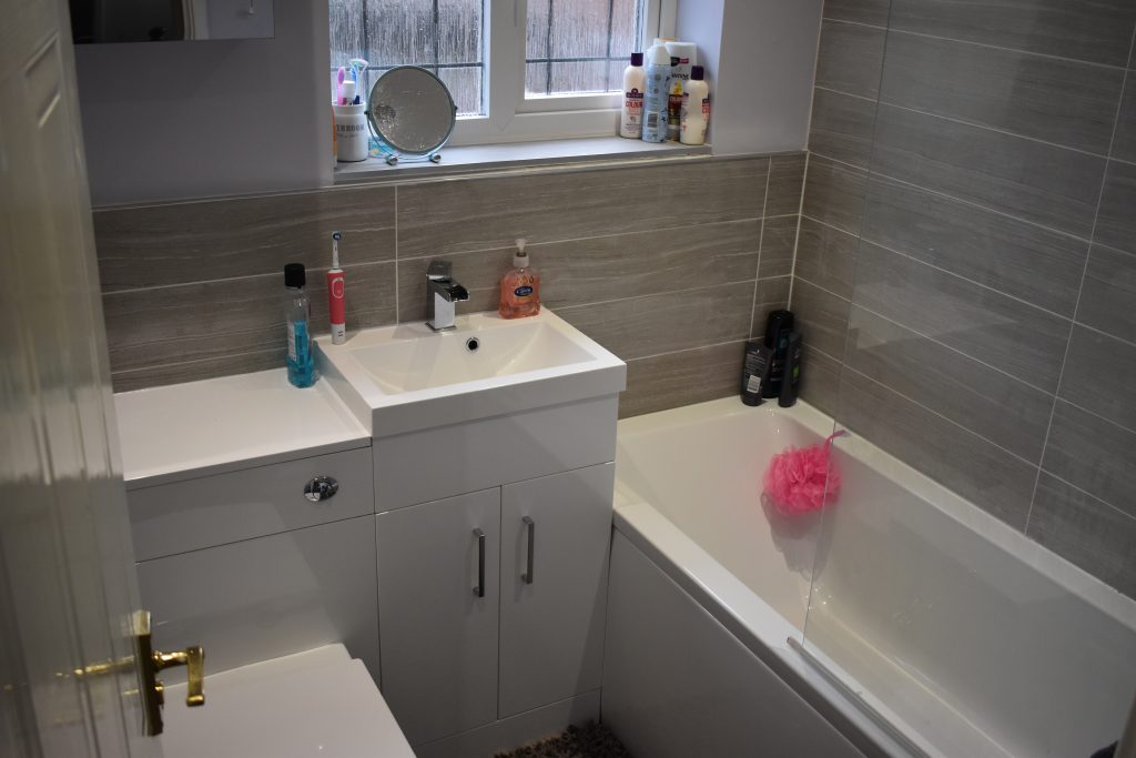 Refitted bathroom with three piece white suite with bath, wash hand basin, W.C with integrated cistern, UPVC double glazed window to the front, chrome towel rail radiator, twin voltage shaver point and tiled floor.