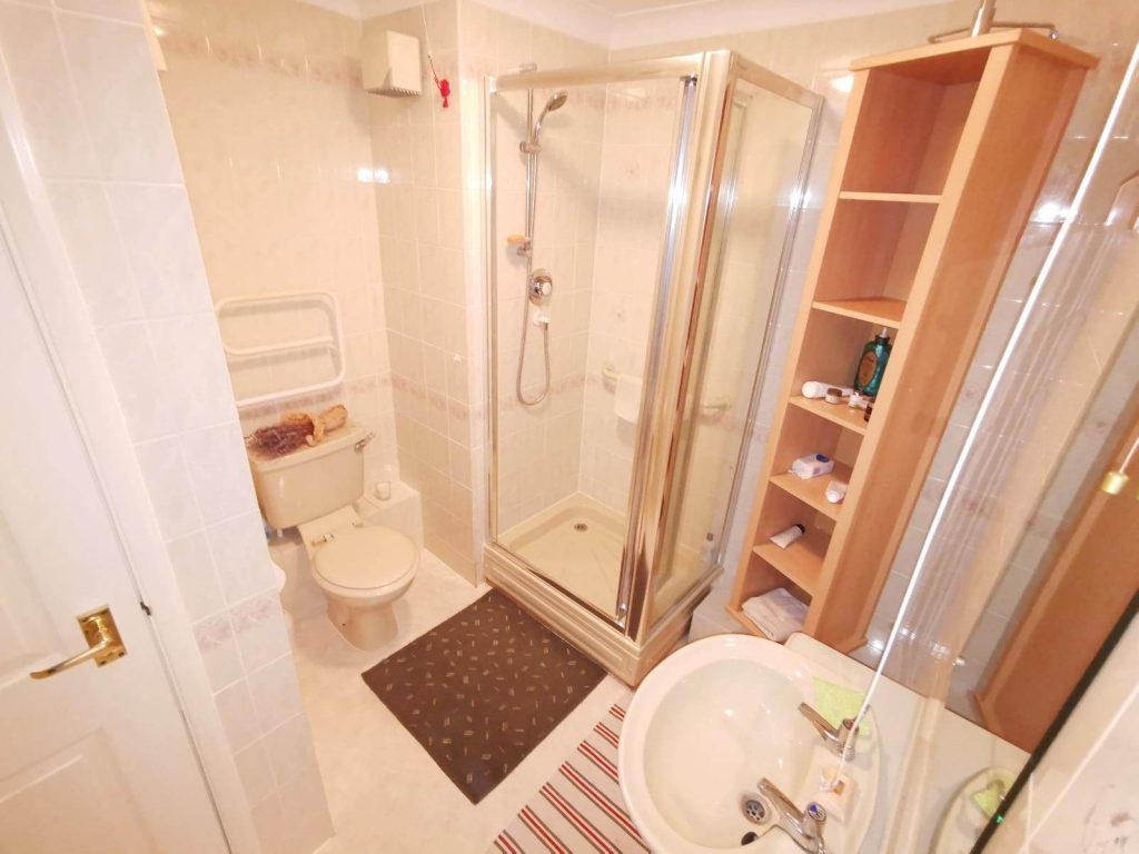 A good-sized bathroom with three-piece white suite comprising close coupled W.C, pedestal wash hand basin, shower enclosure. Tiled walls, vinyl floor, ceiling light point, emergency pull cord, airing cupboard with hot water cylinder.
