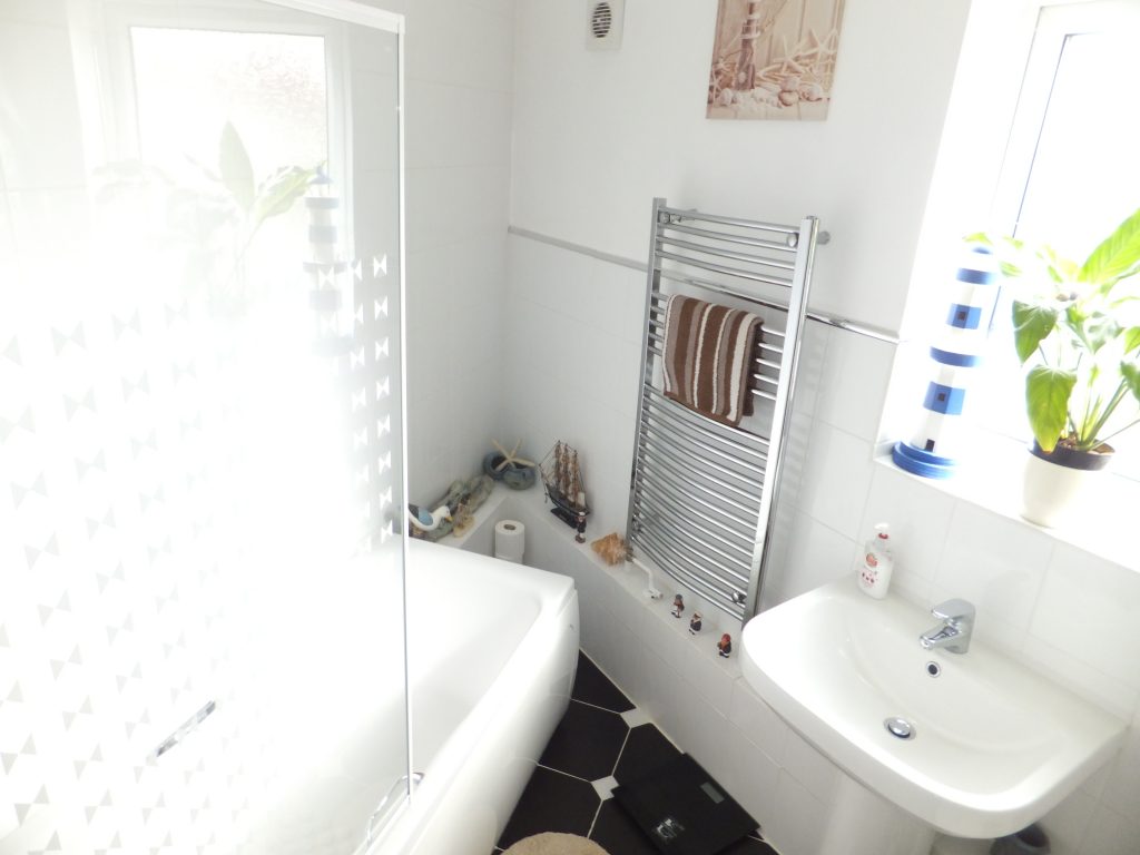 With UPVC double glazed opaque window to the side, wall mounted extractor, ceiling light point, chrome towel rail radiator, part wall tiling, ceramic floor tiling, three-piece white suite comprising; panelled bath with glazed shower screen and Triton electric shower over, pedestal wash hand basin and close coupled W.C.