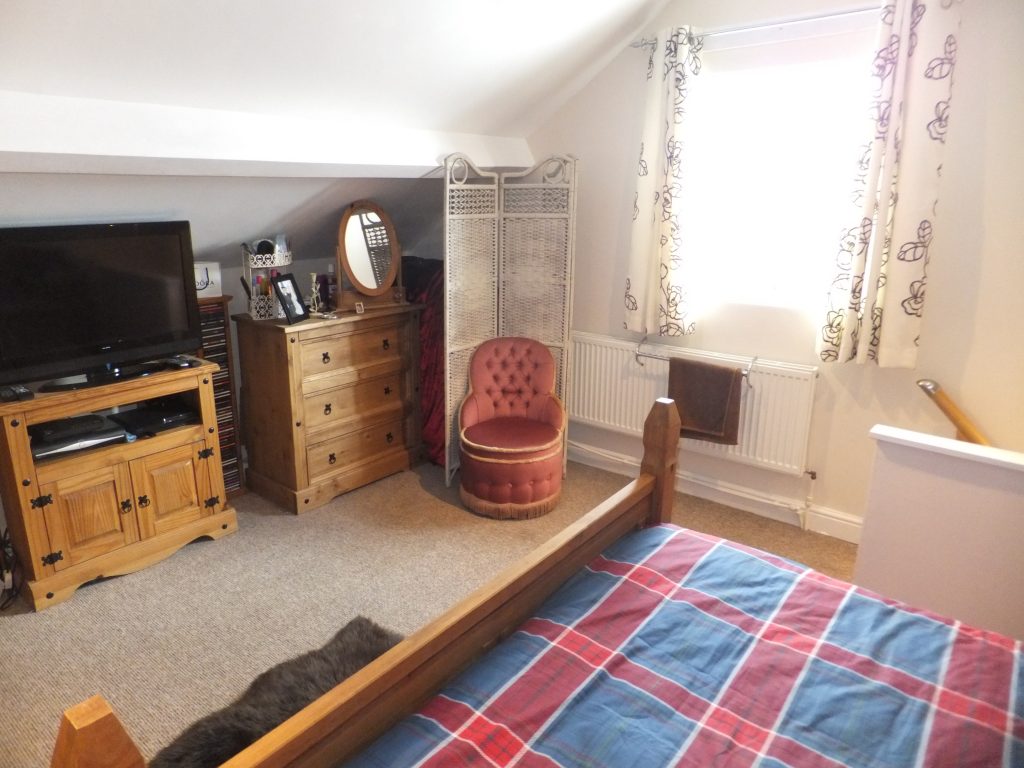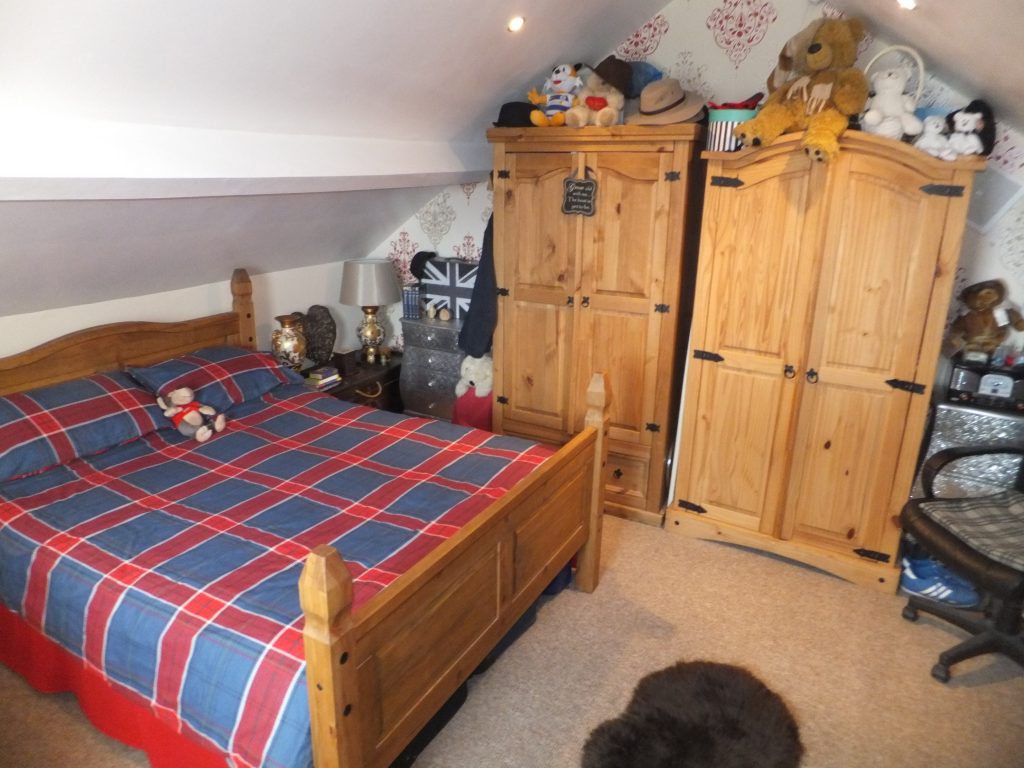 With UPVC double glazed window to the side, radiator, power points, TV aerial point and ceiling spot lights. The ceiling of this room follows the roof line of the property and is currently being used as the master bedroom.