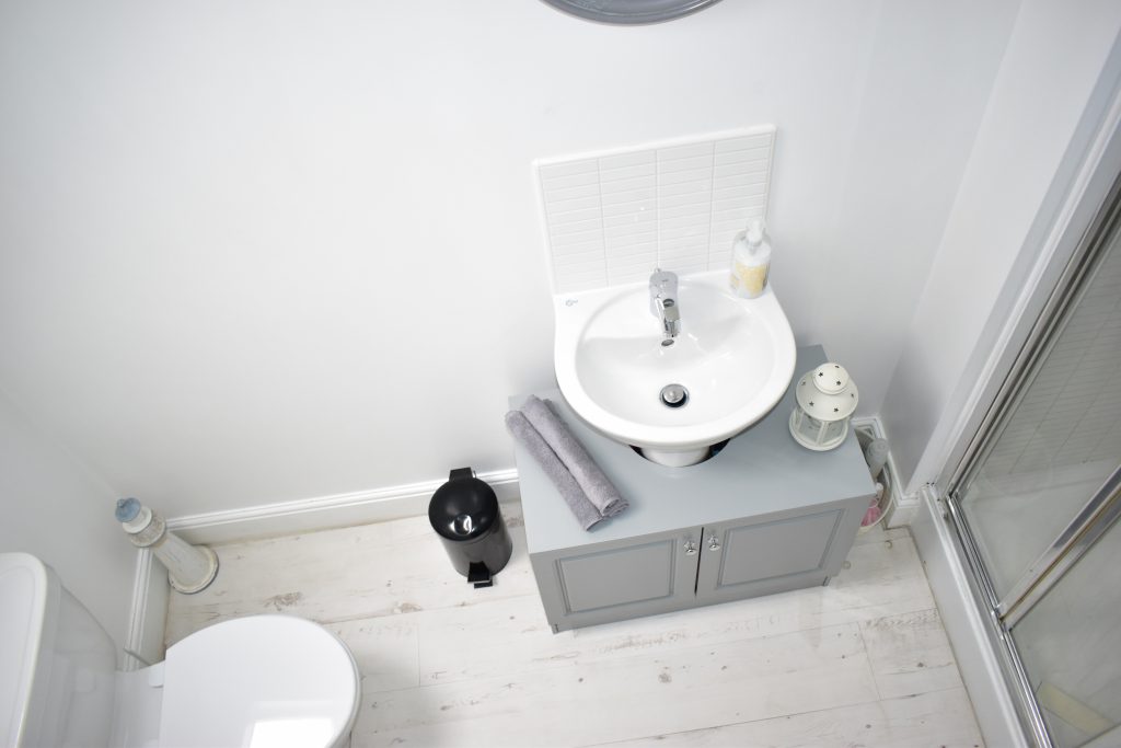 With three-piece suite comprising shower enclosure, close-coupled W.C and a pedestal wash hand basin with tiled back splash, UPVC double-glazed opaque window to the rear and ceiling light point.