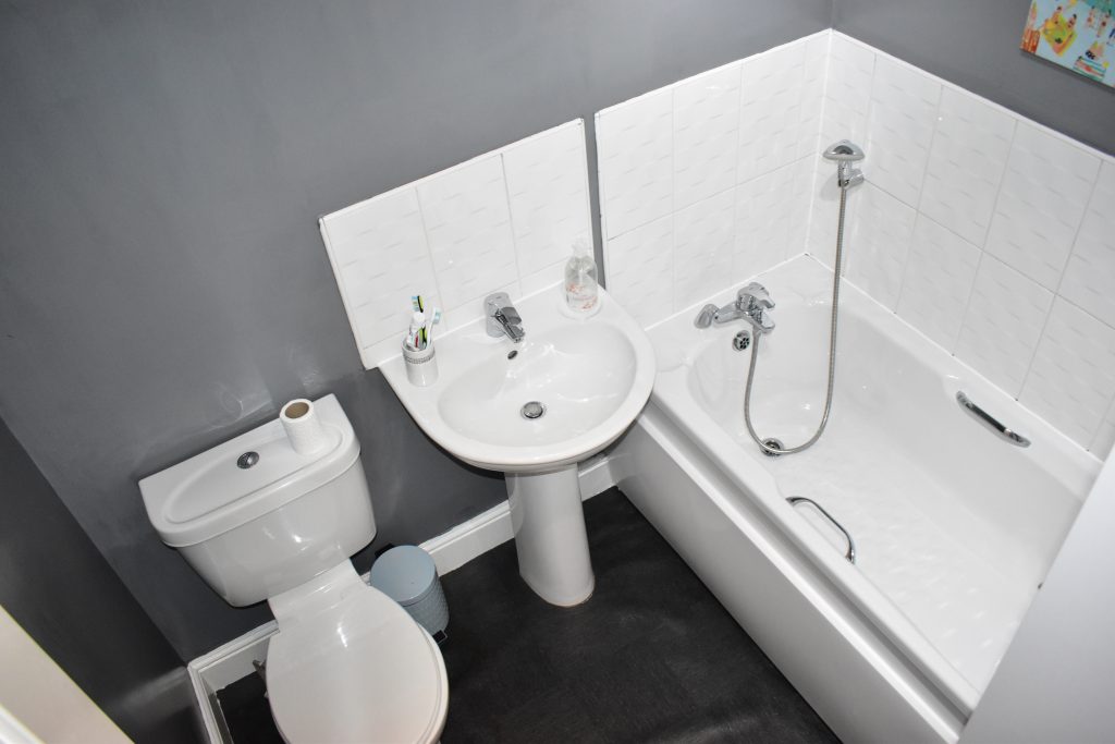 With three-piece suite comprising panelled bath, close-coupled W.C and a pedestal wash hand basin with part wall tiling and ceiling light point.