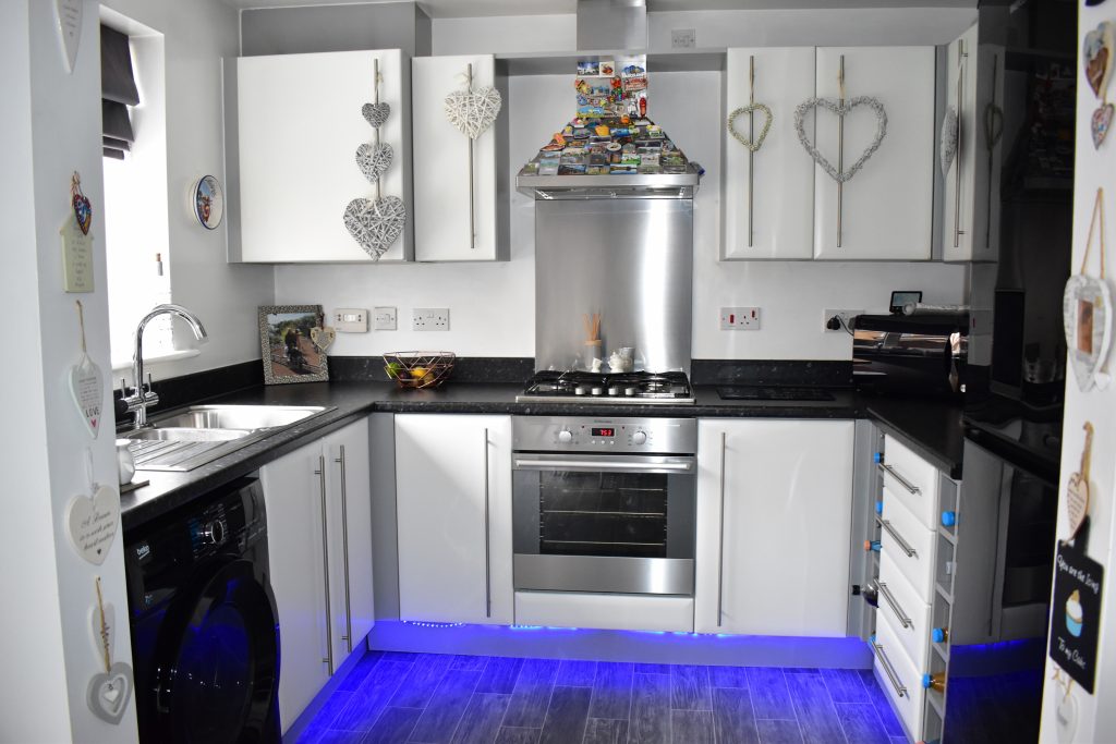 Fitted with a range of modern white gloss wall and base units with roll top work surfaces, built in electric oven/grill with separate four ring gas hob and stylish splash back with extractor above, 1 ½ composite sink with chrome mixer tap, ceiling spot lights, UPVC double glazed window to the rear space for washing machine and space for fridge freezer.
