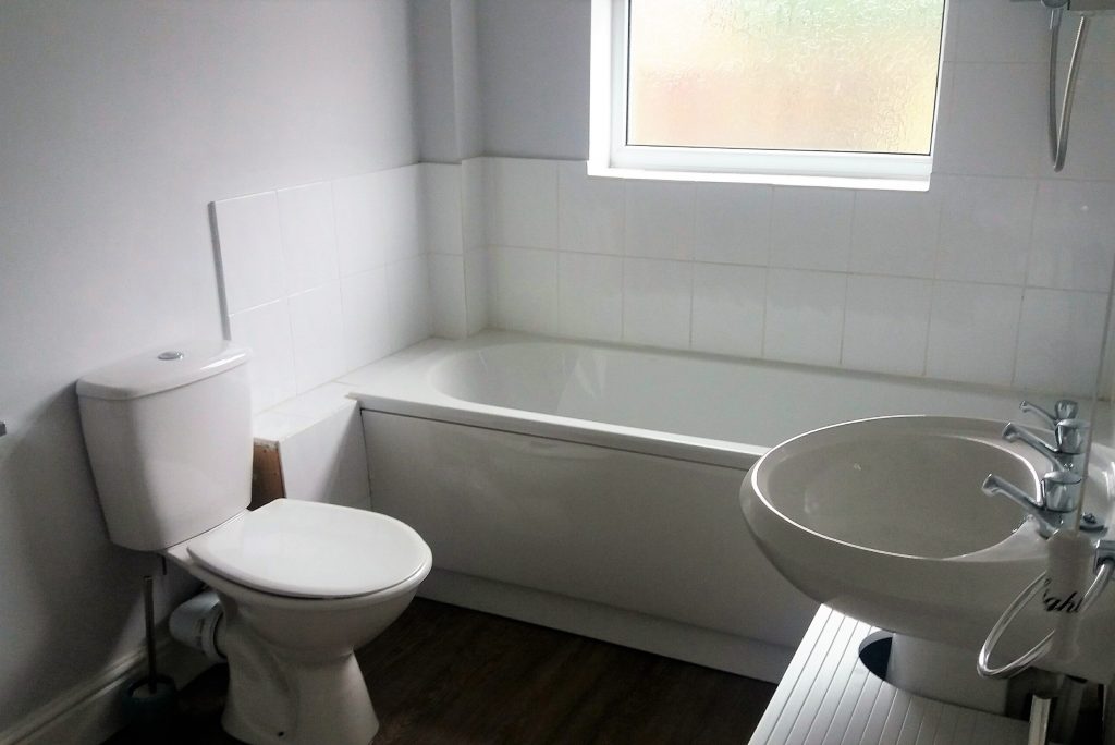 UPVC double glazed opaque window to the rear, three-piece suite comprising; panelled bath with tiled surround and shower head over, pedestal wash hand basin with tiled splash back set within vanity unit and close coupled W.C.