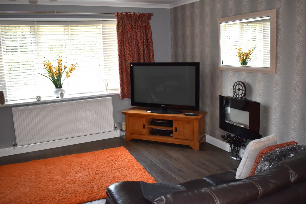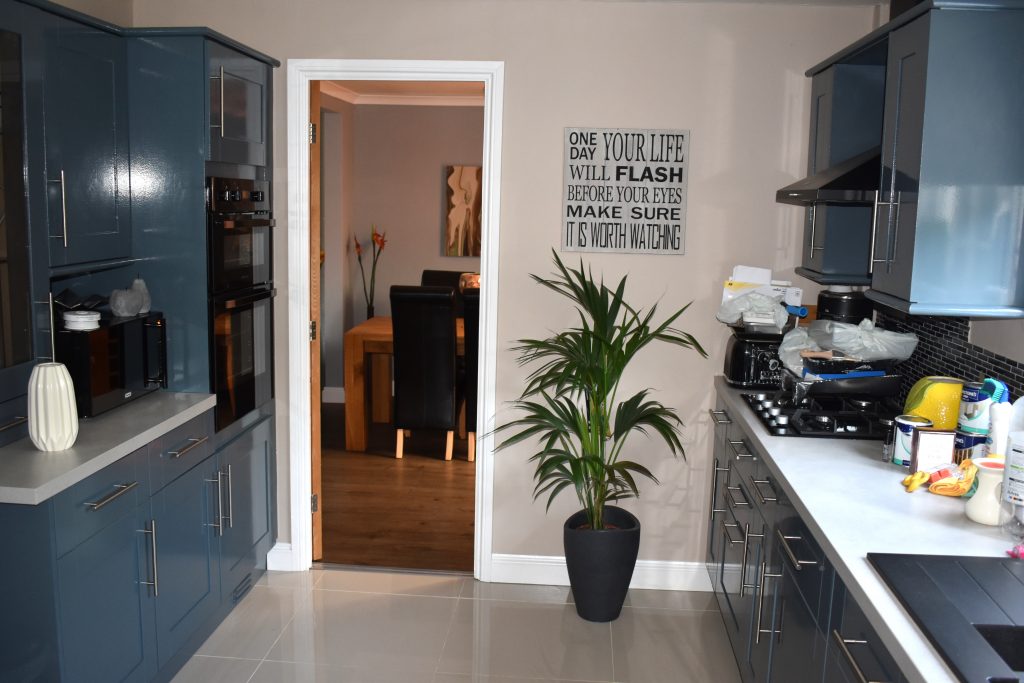 The kitchen has been fitted with a range of wall and base units in an on-trend grey finish together with co-ordinating work surfaces and tiled splashbacks. There is an integrated eye-level double oven and grill, an integrated dishwasher, hob with extractor over, black sink with mixer tap and space for a fridge freezer. The same tiled floor from the hallway flows through into the kitchen and there is also a UPVC double glazed window overlooking the rear garden, power points and ceiling light point.