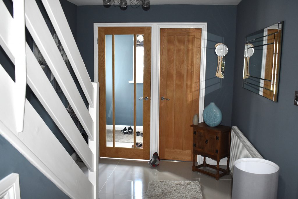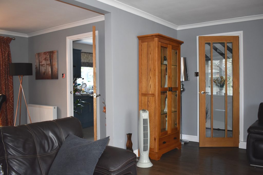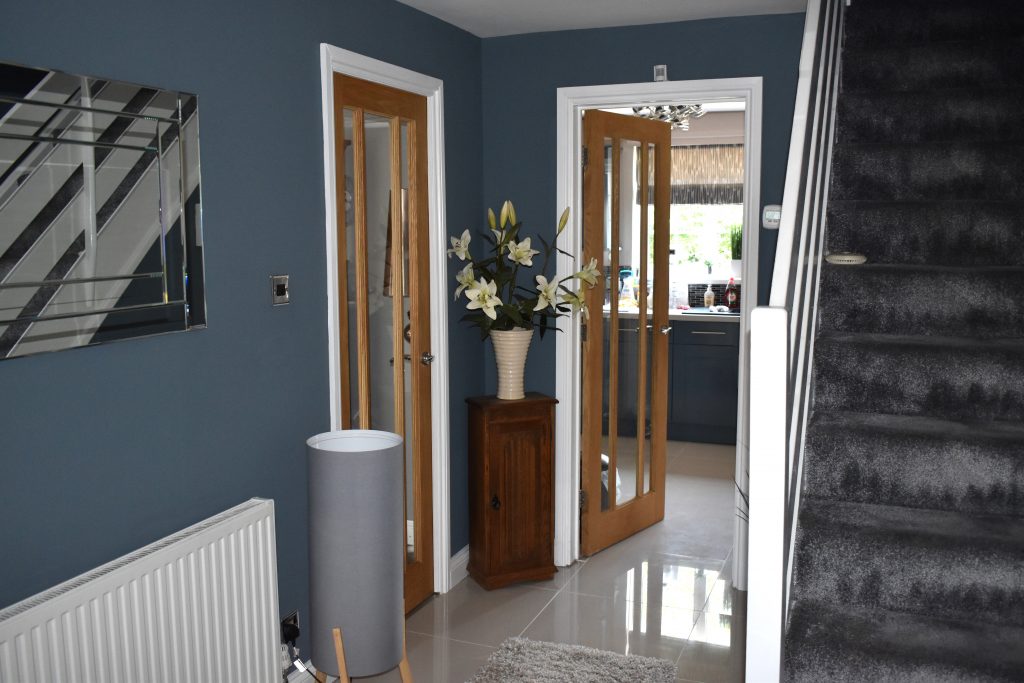 The spacious hallway has a welcoming feel with tiled flooring, stairs to the first-floor landing, radiator, ceiling light point and power point. Contemporary glazed doors have also been fitted throughout the ground floor of the property. The hallway provides access to all of the ground floor rooms and the ground floor W.C.