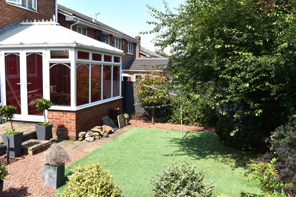 To the front of the property there is a driveway for two cars leading to the garage and entrance door. The front garden is mostly laid to lawn with some mature shrubs and an area of gravel.