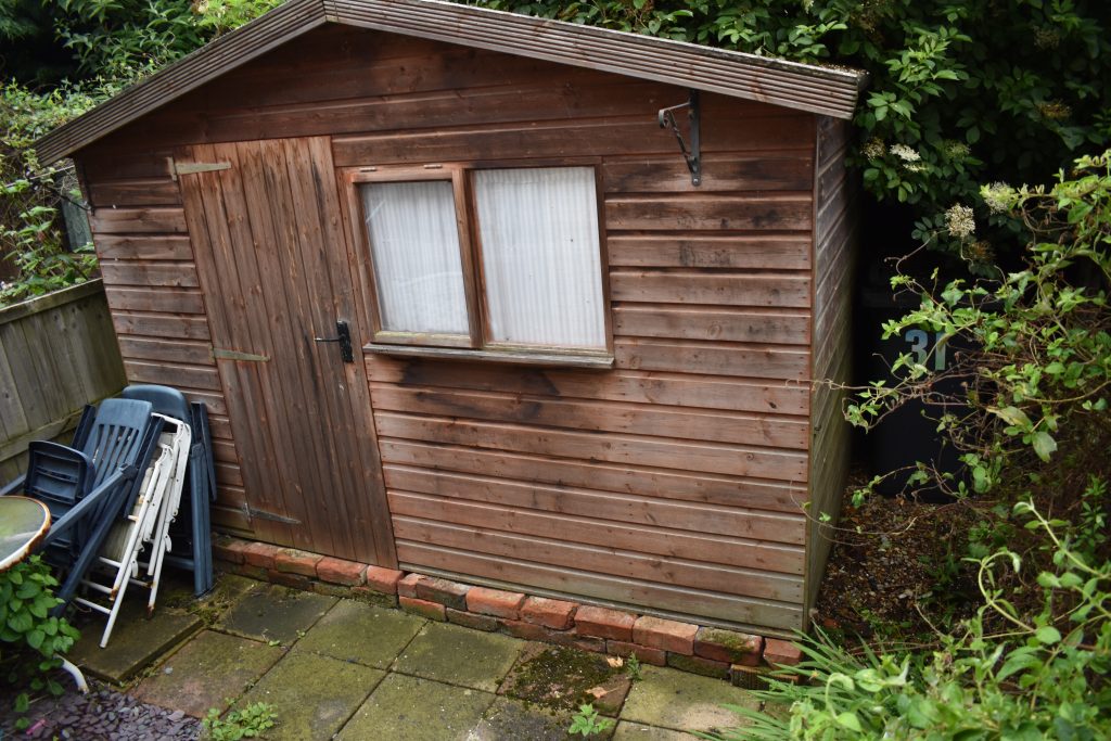 Small seating area and a pathway leading to the front. A large wooden shed, this has been insulated and lined internally.