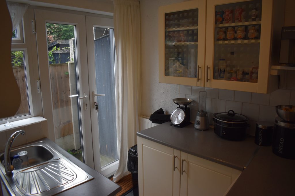 With wall and base units in white with granite effect roll top work surfaces, stainless steel sink with chrome mixer taps, built-in four ring gas hob with integrated oven and grill, space for fridge, power points, ceiling spot lights, radiator, UPVC double glazed window and UPVC double glazed French doors to the rear. Under stairs utility area with space and plumbing for washing machine.
