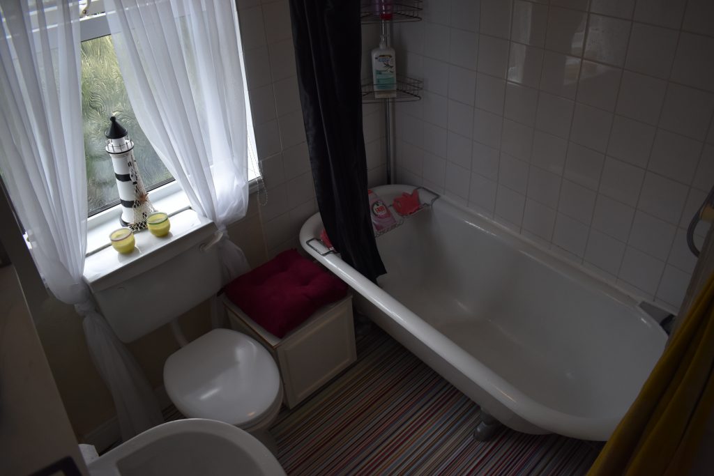With three-piece white suite comprising cast iron bath on legs with tiled surrounds, Essentials Mira electric shower over, low flush W.C, pedestal wash hand basin with tiled splash backs, UPVC double glazed opaque window to the rear, ceiling light point, extractor, radiator and airing cupboard.