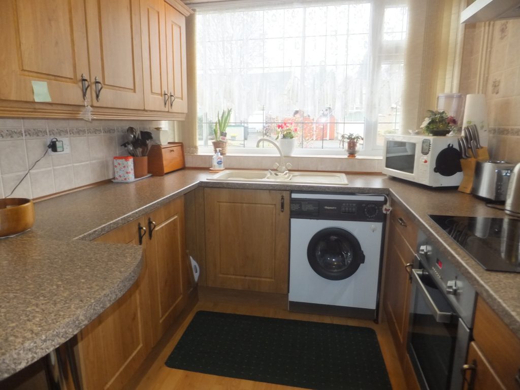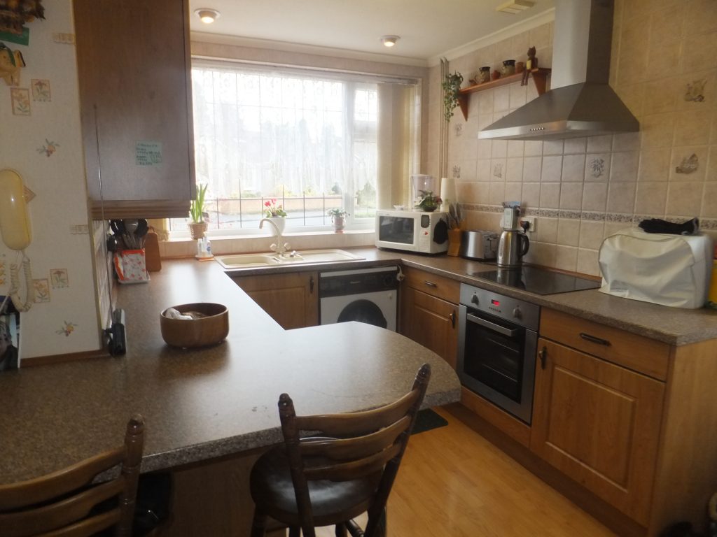 With ceiling coving, ceiling light point, UPVC double glazed leaded window to the front, a range of wall and base units with roll top surfaces, 1 ½ bowl single drainer sink with mixer taps, four ring electric hob with integrated oven and grill, space and plumbing for washing machine, space for fridge freezer, thermostatically controlled radiator, wall tiling, power points, ceiling light point, UPVC double glazed door opening to the driveway at the side and door to pantry.
