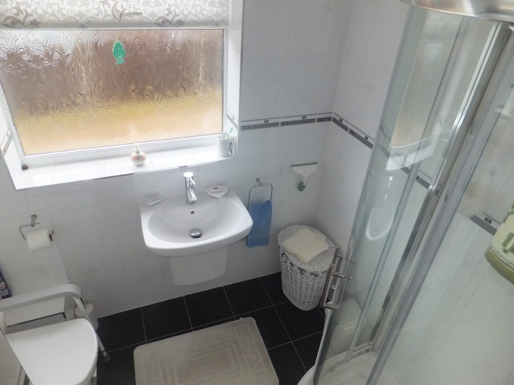 This modern bathroom is fully tiled with corner shower cubicle, wall mounted wash hand basin with mixer taps, W.C, tiled floor, UPVC double glazed opaque window and ceiling light point.