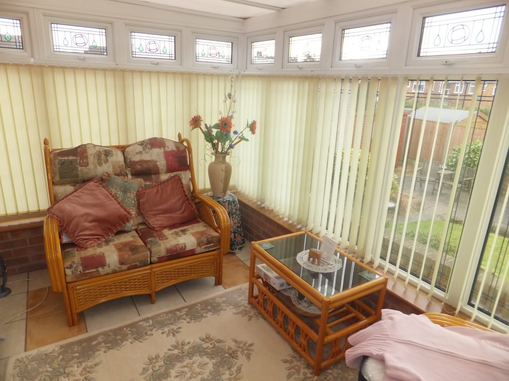 With ceiling coving, ceiling light point, thermostatically controlled radiator, power points and UPVC double glazed patio doors opening into the conservatory.