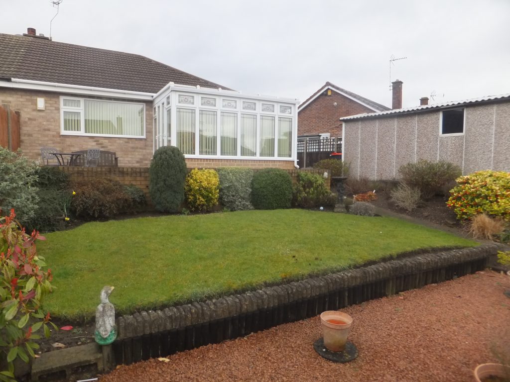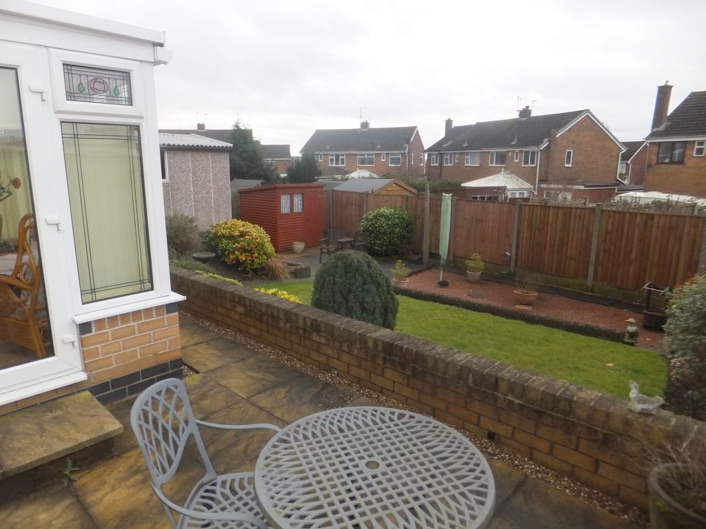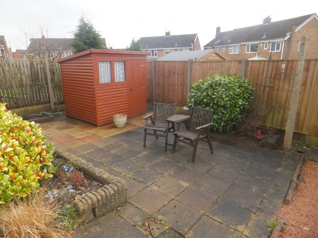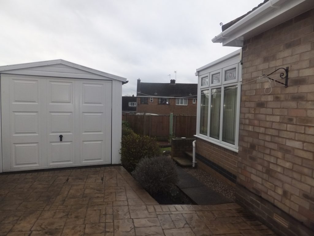 Attractive rear garden with patio areas, lawn area, gravel area and also hard standing for a garden shed. The rear garden is fully enclosed. There is outside lighting and outside tap. There is a detached garage with up and over door and window to the side.