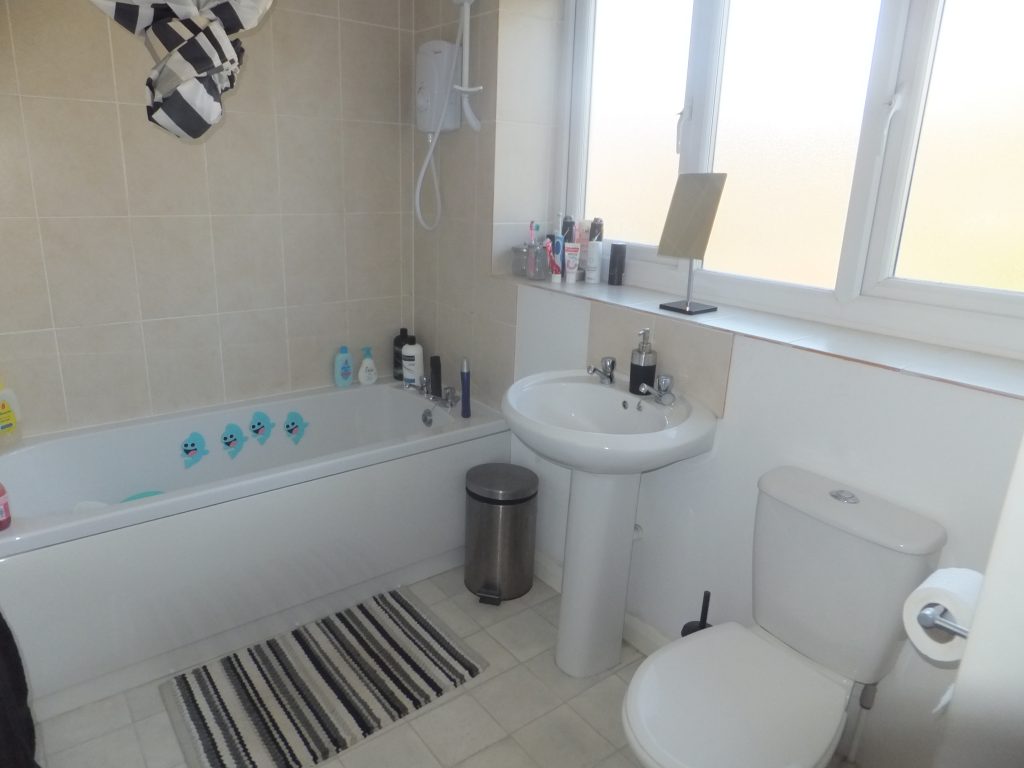 With UPVC double glazed opaque window to the rear, three-piece white suite comprising panelled bath with tiled surround and Redring electric shower over, pedestal wash hand basin, closed coupled W.C, chrome towel rail radiator and built in storage cupboard.