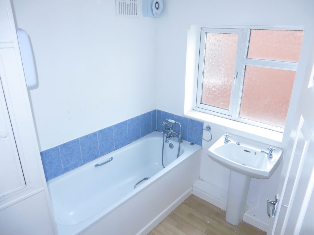 The bathroom has a double glazed opaque window to the side, white panelled bath with tiled surround and shower over, pedestal wash hand basin, ceiling light point and extractor fan.