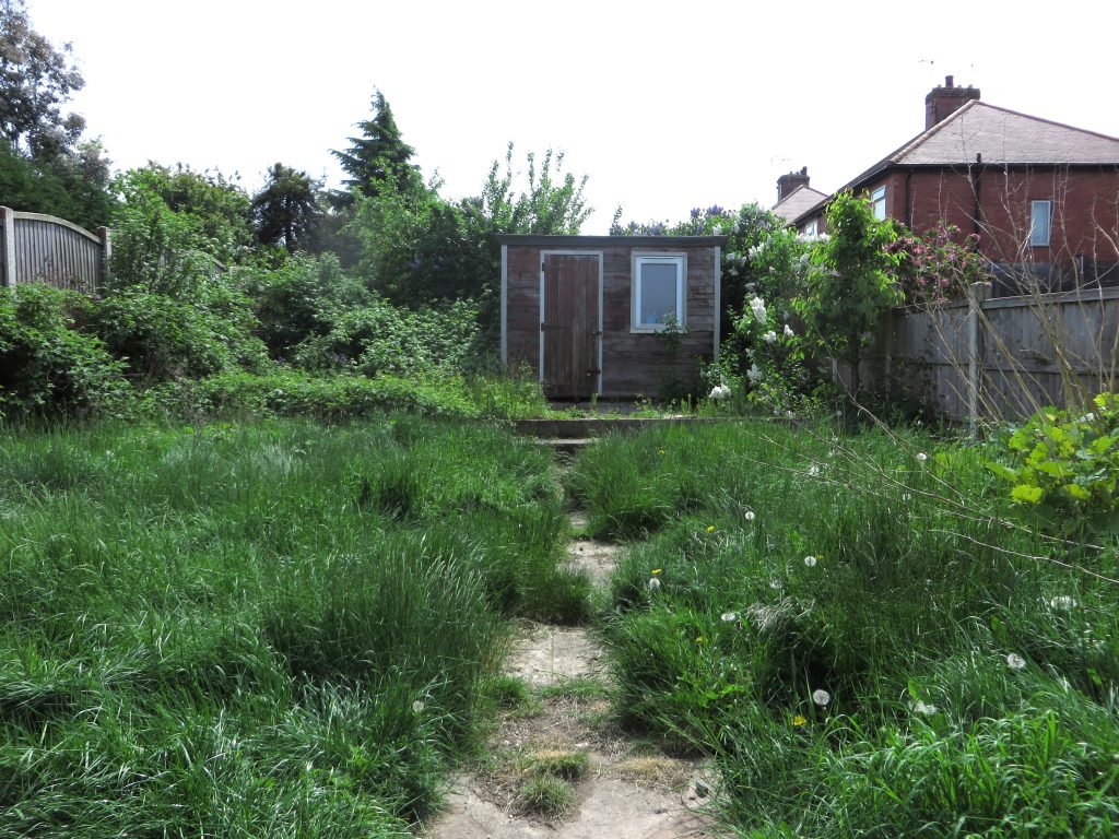 There is a raised lawn surrounded by a mixture of fencing and hedgerow, useful garden shed and patio area.
