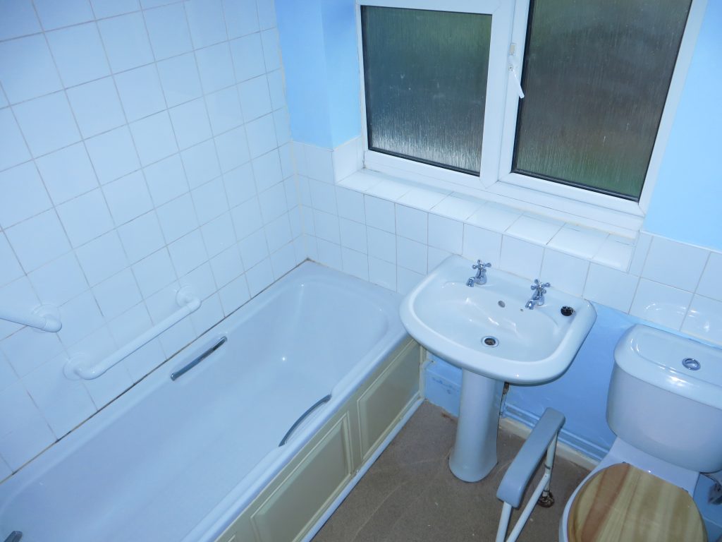 With three-piece white suite comprising panelled bath with Mira electric shower over, pedestal wash hand basin, closed coupled W.C, radiator, ceiling light point and UPVC double glazed opaque window to the rear.