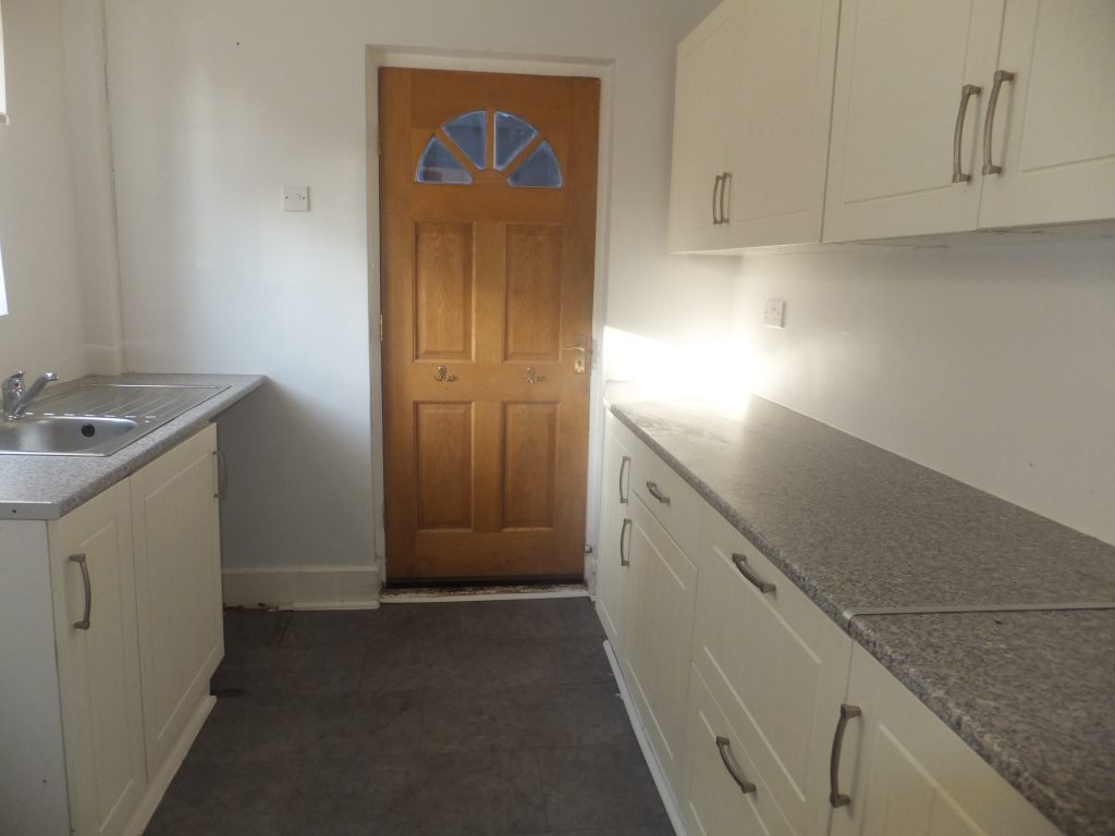 The kitchen has been fitted with wall and base units with roll top work surfaces, single drainer stainless steel sink with chrome mixer taps, UPVC double glazed window to the side, space and plumbing for washing machine, ceiling light point and a doorway to the rear.