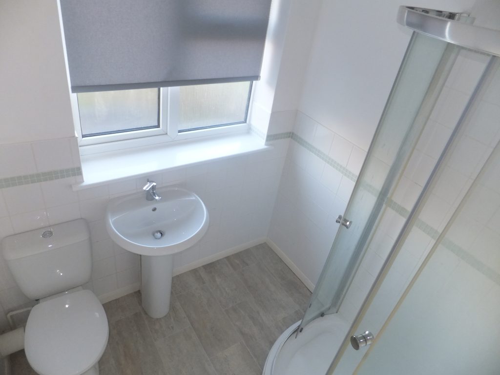 With UPVC double glazed opaque window to the rear, half wall tiling, three-piece white suite comprising shower cubicle with Tristan shower, pedestal wash hand basin with chrome mixers, close coupled W.C, radiator and ceiling light point.