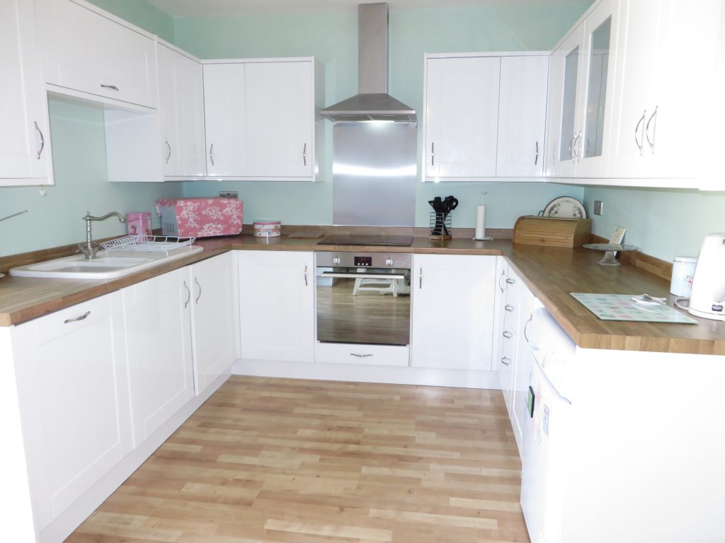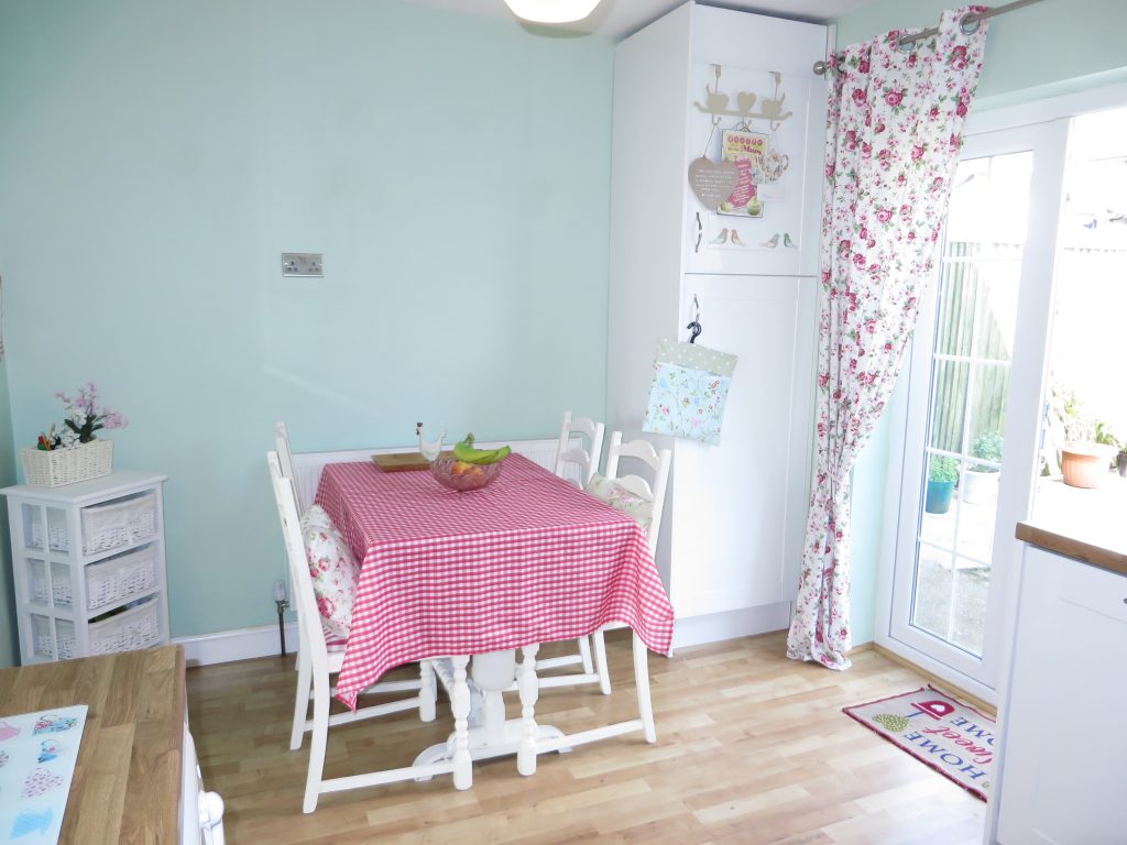 Modern dining-kitchen fitted with a range of wall and base units, 1 ½ bowl single drainer sink, integrated oven and hob with stainless steel splash back, extractor above, ceiling light point, power points, thermostatically controlled radiator and UPVC double glazed patio doors leading onto the rear garden.