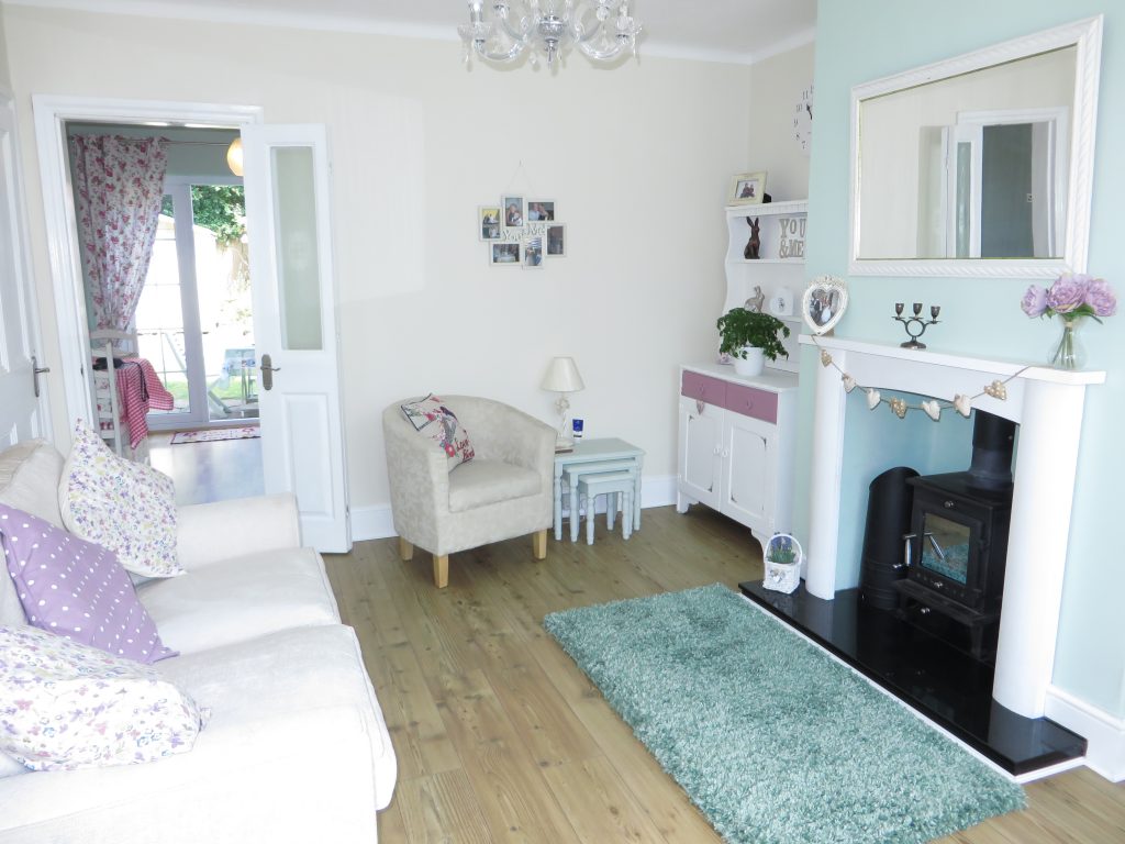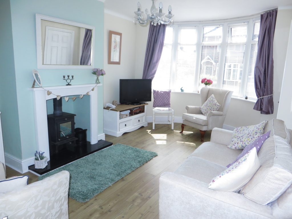 With feature fire place with cast iron multi-fuel burner, UPVC double glazed bay window to the front, deep skirtings, telephone point, TV aerial point, ceiling light point and ceiling coving. White panelled door to under stairs storage cupboard.