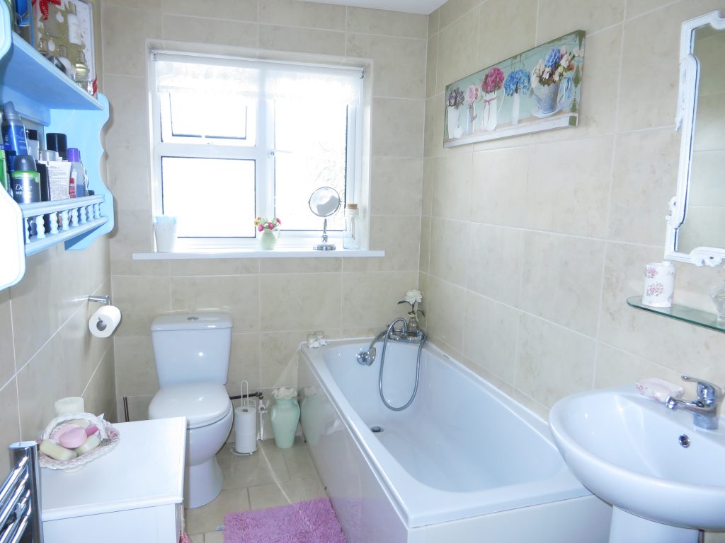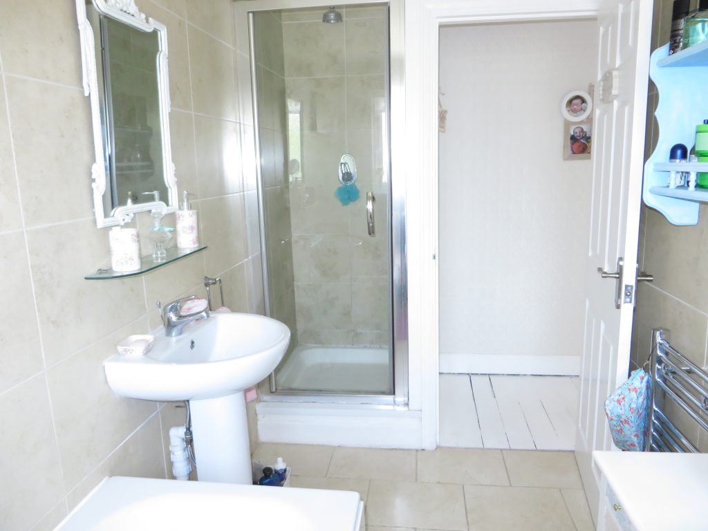 Large bathroom with four piece suite comprising tiled shower cubicle, pedestal wash hand basin, panelled bath with offset shower head mixer taps, closed coupled W.C, chrome towel rail radiator, ceiling spot lights and UPVC double glazed opaque window to rear.
