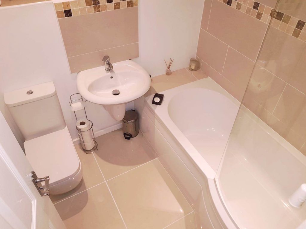 Fitted with a modern white three-piece suite comprising of p-shaped bath with shower over, low level W.C and pedestal wash hand basin. Part tiled walls, floor tiles and UPVC double glazed opaque window to the rear.