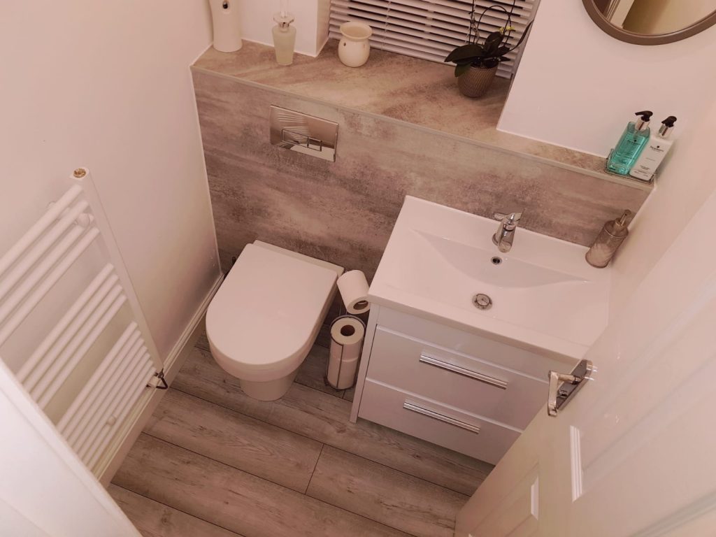 Fitted with a sleek white suite comprising of W.C and pedestal wash hand basin set into vanity unit. There is a towel rail radiator and UPVC double glazed opaque window to the rear.