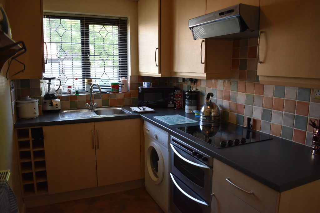 With a range of wall and base units, roll top work surfaces, tiled surrounds, ceramic hob with extractor over, integrated oven, radiator, ceiling light point, power points and window to the front.