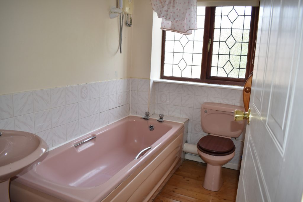 With three piece suite with W.C, wash hand basin, bath with electric shower over, part wall tiling, window to the front and ceiling light point.