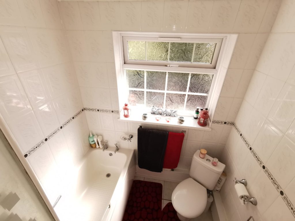 With floor and wall tiling, three-piece suite in white comprising bath with shower screen and shower over, closed coupled W.C, wash hand basin with mixer taps, UPVC double glazed opaque window to the rear and ceiling light point.
