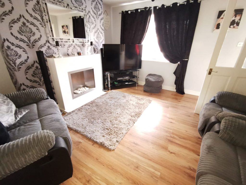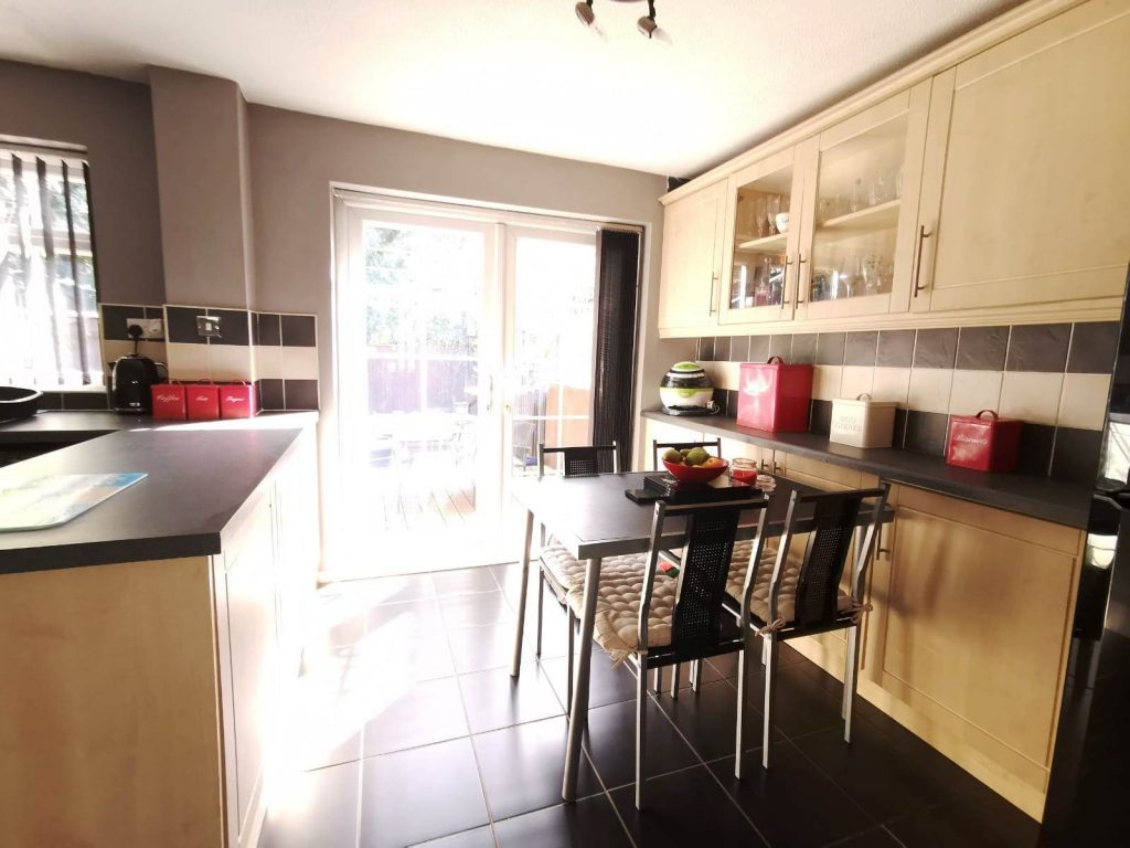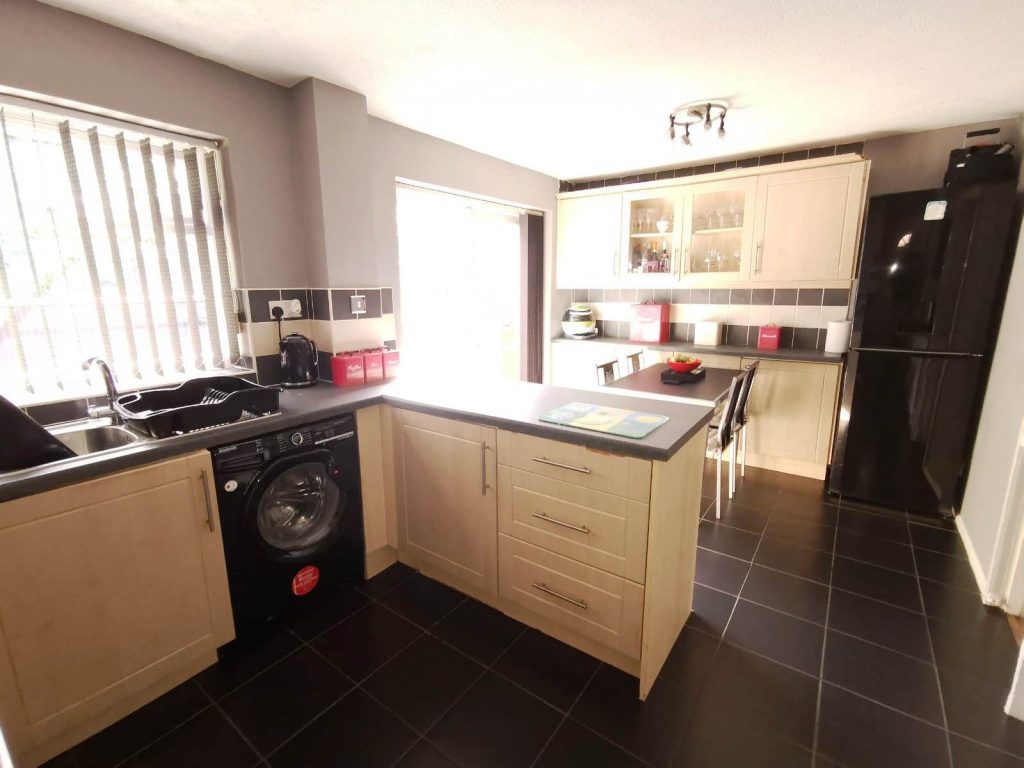 15’6” x 9’6” Both the dining and kitchen areas have been fitted with a range of wall and base units in maple with roll top work surfaces and coordinated tile surround offering ample storage space. There is single drainer sink with mixer tap, integrated stainless-steel oven and grill, four ring hob with stainless steel canopy style extractor over, space and plumbing for washing machine, space for fridge freezer, thermostatically controlled radiator, power points, two ceiling light point and tile effect flooring. The kitchen has UPVC double glazed window to the rear and side entrance door with the dining area benefiting form patio doors to the rear perfect for indoor outdoor living.