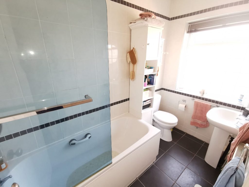 Three piece white suite with bath with shower over, wash hand basin and low level W.C, part tiled walls, radiator, floor tiling, ceiling light point and double glazed opaque window to the front.